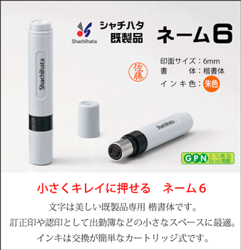 【商品仕様】 ・商品名 シャチハタ ネーム6 ・文字書 楷書体 ・印面サイズ 直径6ミリ ・インキ色 朱色 ・インキ質 顔料系(長期保存・耐久性に優れています) ※補充インキは別売りとなっております 注文方法と注意点 ●印面内容が注文者名と異なるお客様、複数ご購入されるお客様は、商品を買いカゴに入れて「買い物ステップ」最後の「注文確認ページ」にある「備考欄」に印面内容をご記入ください。