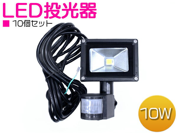 ※お得【10個セット】防犯対策に最適♪ 人感センサー付 LED投光器 10W AC100V 5mコード付属 ホワイト発光 白 6000K 6000ケルビン アルミ ブラック 家庭用コンセント対応 【屋内灯 屋外灯 防犯カメラ LED照明 船舶 作業用 照明 玄関 防犯対策 自動点灯 スポットライト】