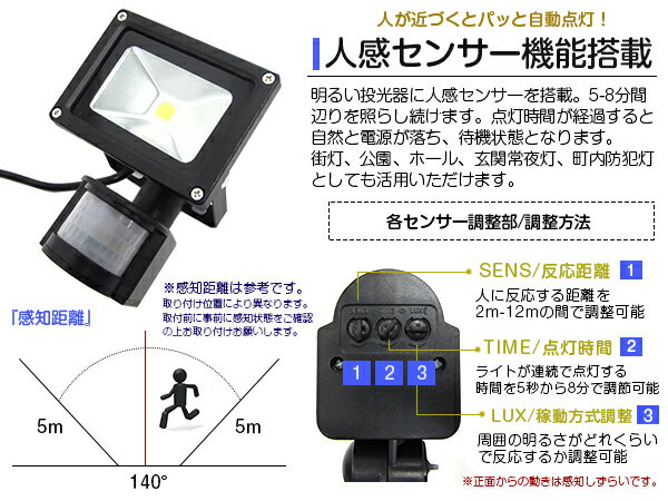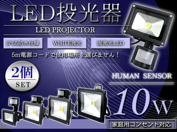 ※お得【2個セット】防犯対策に最適♪ 人感センサー付 LED投光器 10W AC100V 5mコード付属 ホワイト発光 白 6000K 6000ケルビン アルミ ブラック 家庭用コンセント対応 【屋内灯 屋外灯 防犯カメラ LED照明 船舶 作業用 照明 玄関 防犯対策 自動点灯 スポットライト】